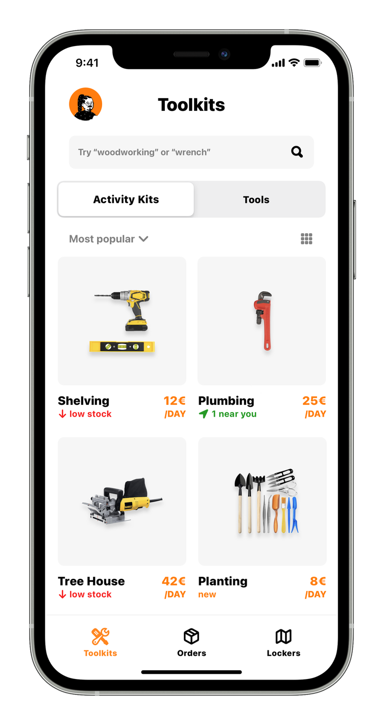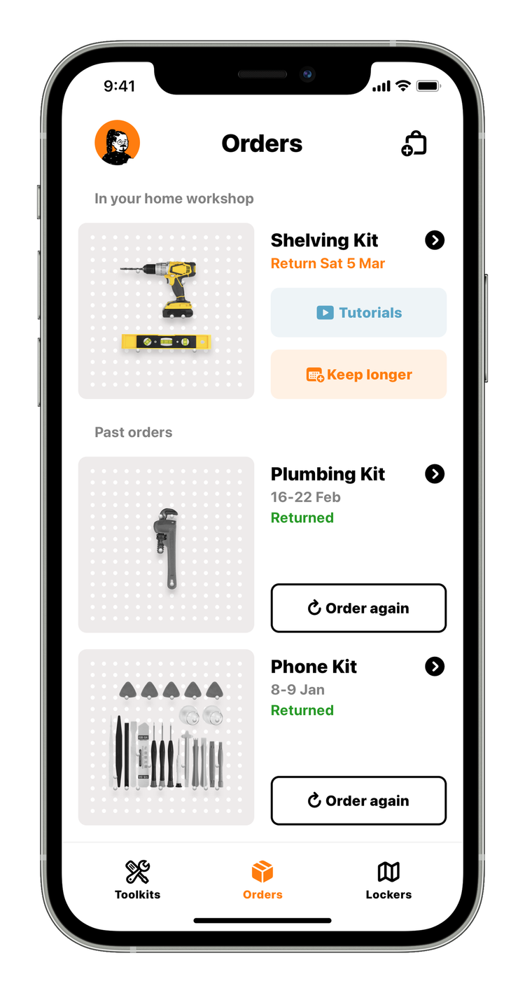 From the Orders tab, users manage the tools they have at home with quick access to tutorials and rental extensions. They can also repeat a past order and navigate to more details.