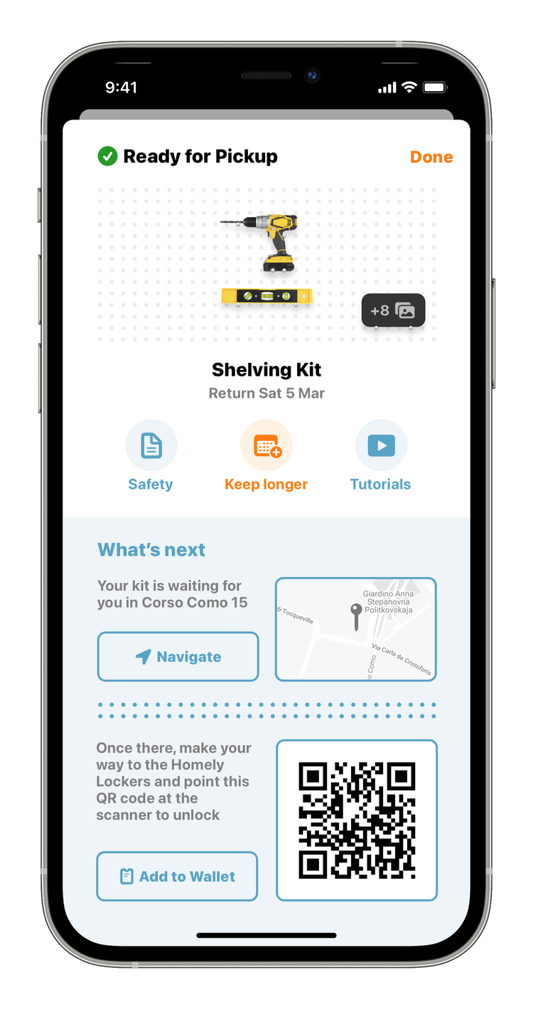 After booking, Homely displays the order neatly placed on a tool panel along with the steps to pick it up. Notice how individual tools and the photos button are secured to the panel.